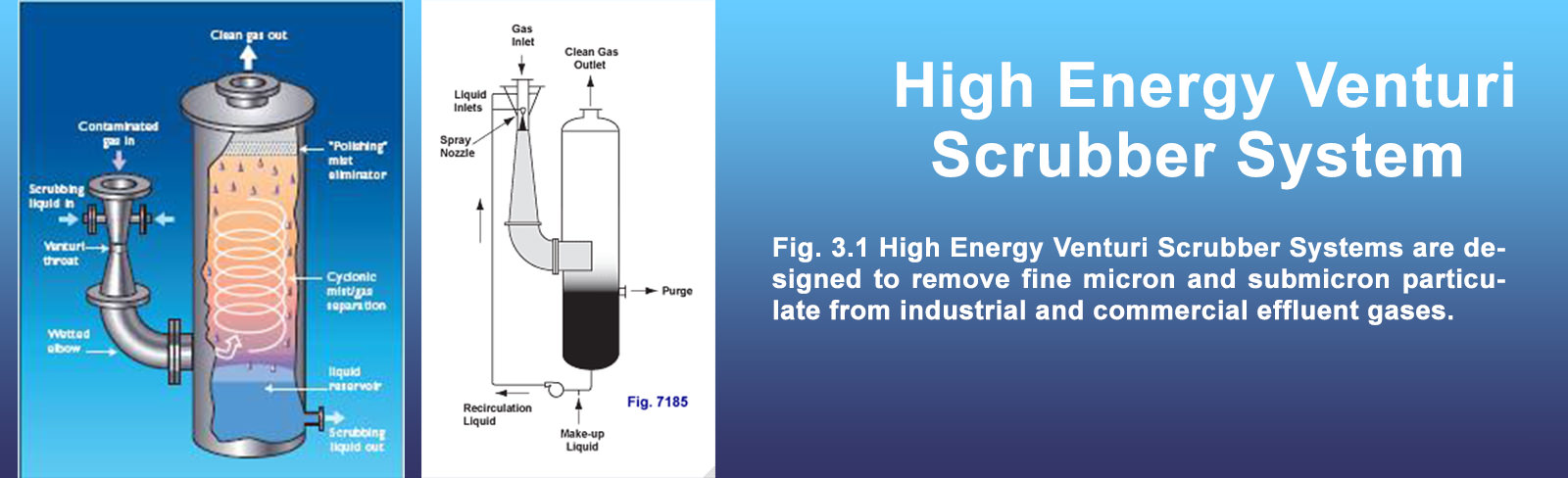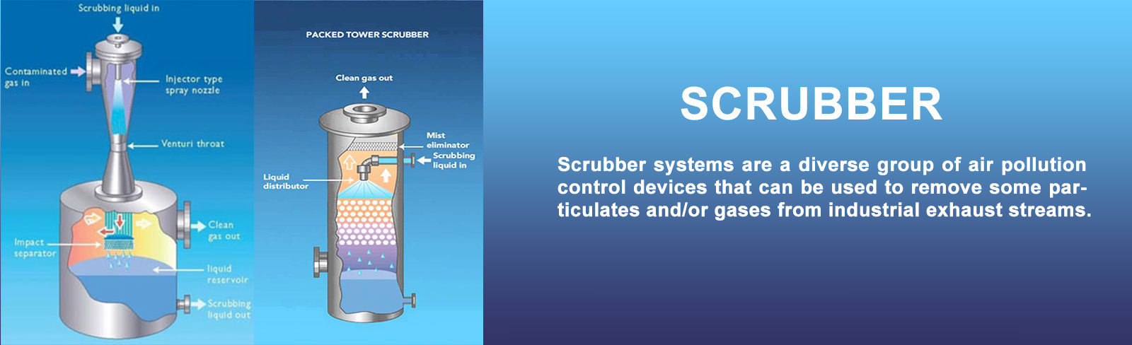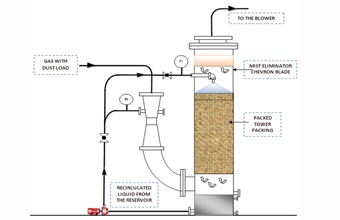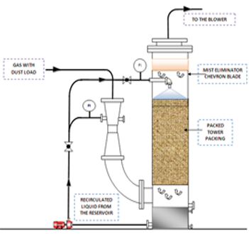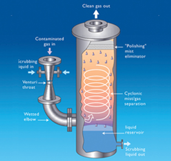 Particulate contaminants are removed through impaction by the high velocity spray of scrubbing liquid. Gases and odors are eliminated through absorption and/or chemical reaction between the gases and scrubbing liquid. When properly matched to the application, these scrubbers, by their nature, are better able to cope with the high temperatures, heavy contaminant loads, and corrosive conditions often encountered.