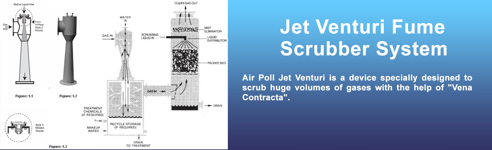 There is sudden expansion and contraction near the venture throat where the velocity of the gas is very high and separation takes place which is known as Vena Contracta. The Motive fluid, generally water leaves nozzle in a hollow cone spray, creating a draft which draws the gases and vapors in to the moving stream where it is continuously scrubbed. Jet Venturi scrubber is highly efficient for the fume/ gas scrubbing.